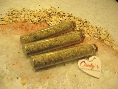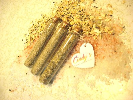 This Herbal bath soak designed to soothe the skin. Oatmeal is known for soothing skin irritations, such as sun burns, burns, rashes, or dry skin. Chamomile helps to accelerate cell growth and tighten pores. While the minerals from the two kinds of salt absorbs through your skin. This adds minerals needed to your skin and body. Lavender oil to relax your mind. Leave your troubles behind, as you relax in a nice warm bath. Each vial is enough for one bath.