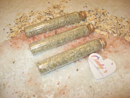 Materials : Dead sea Salt, oat meal, dried chamomile, essential oils, lavender Pedals, vial, Epsom Salt,